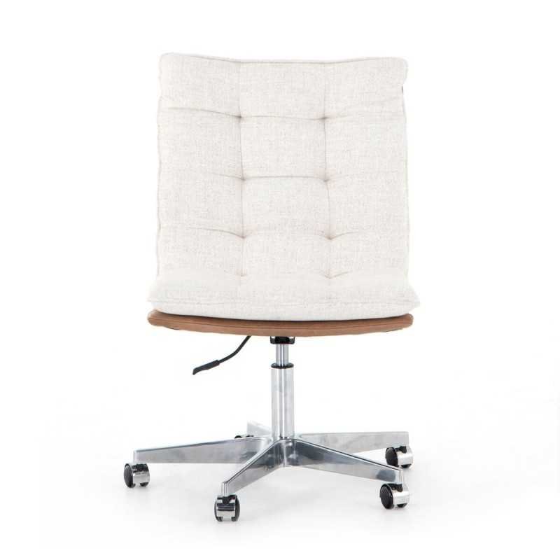 Where modern design meets relaxed sophistication, this statement office chair blends elevated materials with effortless style. Cream linen-blend seating offers a soft, textured feel, while a warm tan top-grain leather back adds depth and richness. Subtle tufting enhances the tactile appeal, and a sleek stainless steel base with smooth casters and adjustable height ensures comfort and ease throughout your day—perfect for a refined, contemporary workspace.